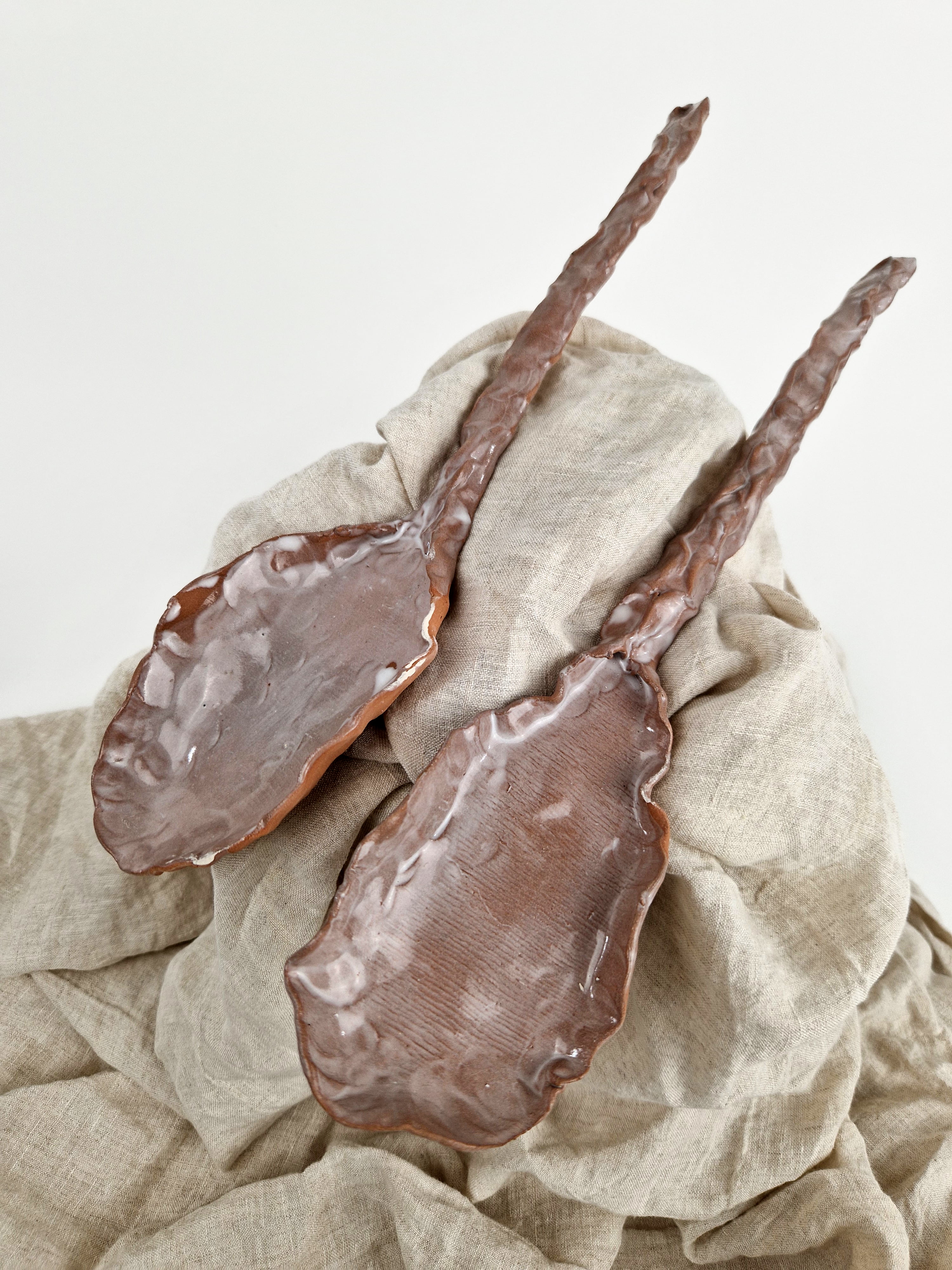 Coppia di cucchiai modellati a mano in grés porcellanato.