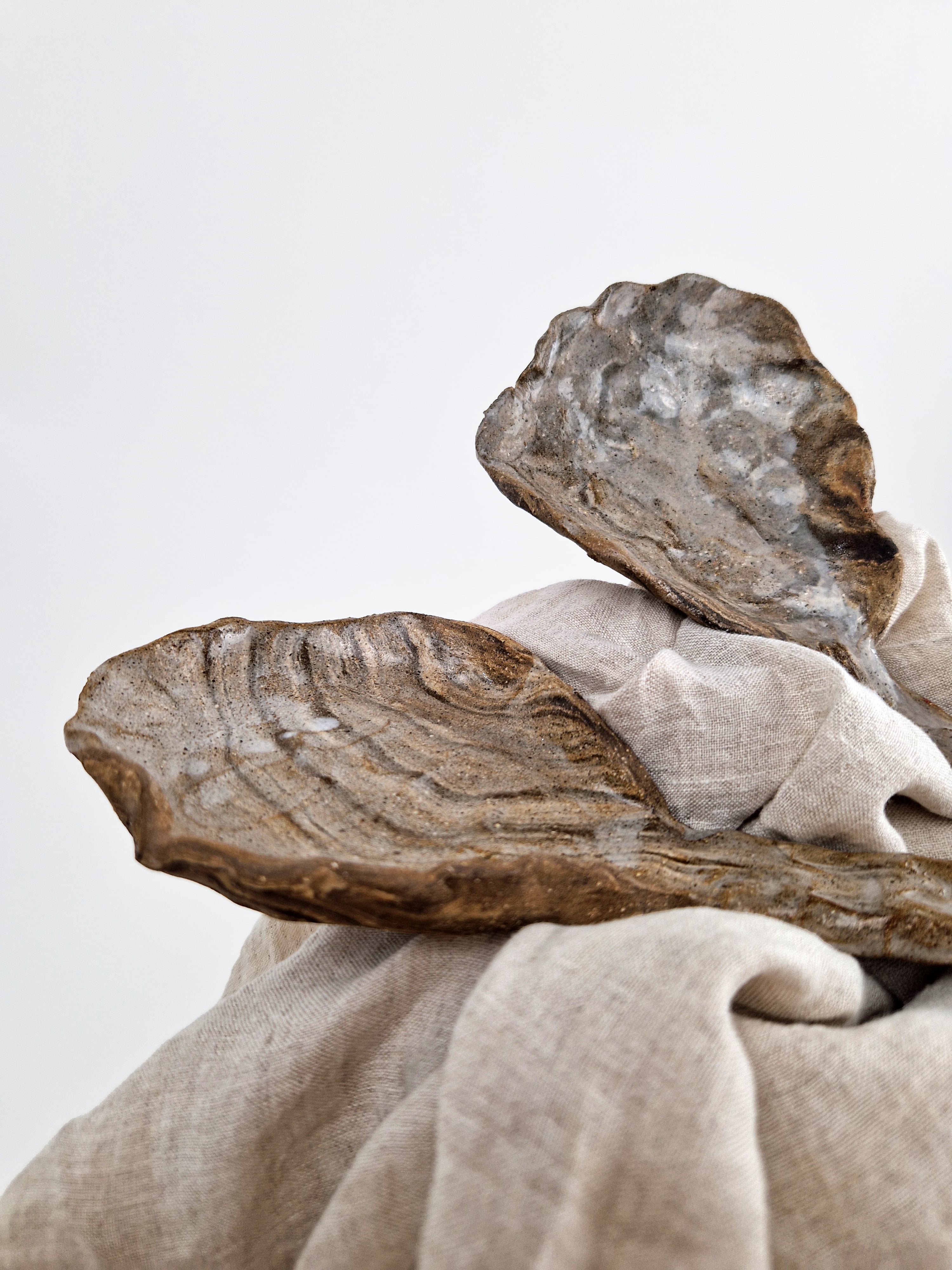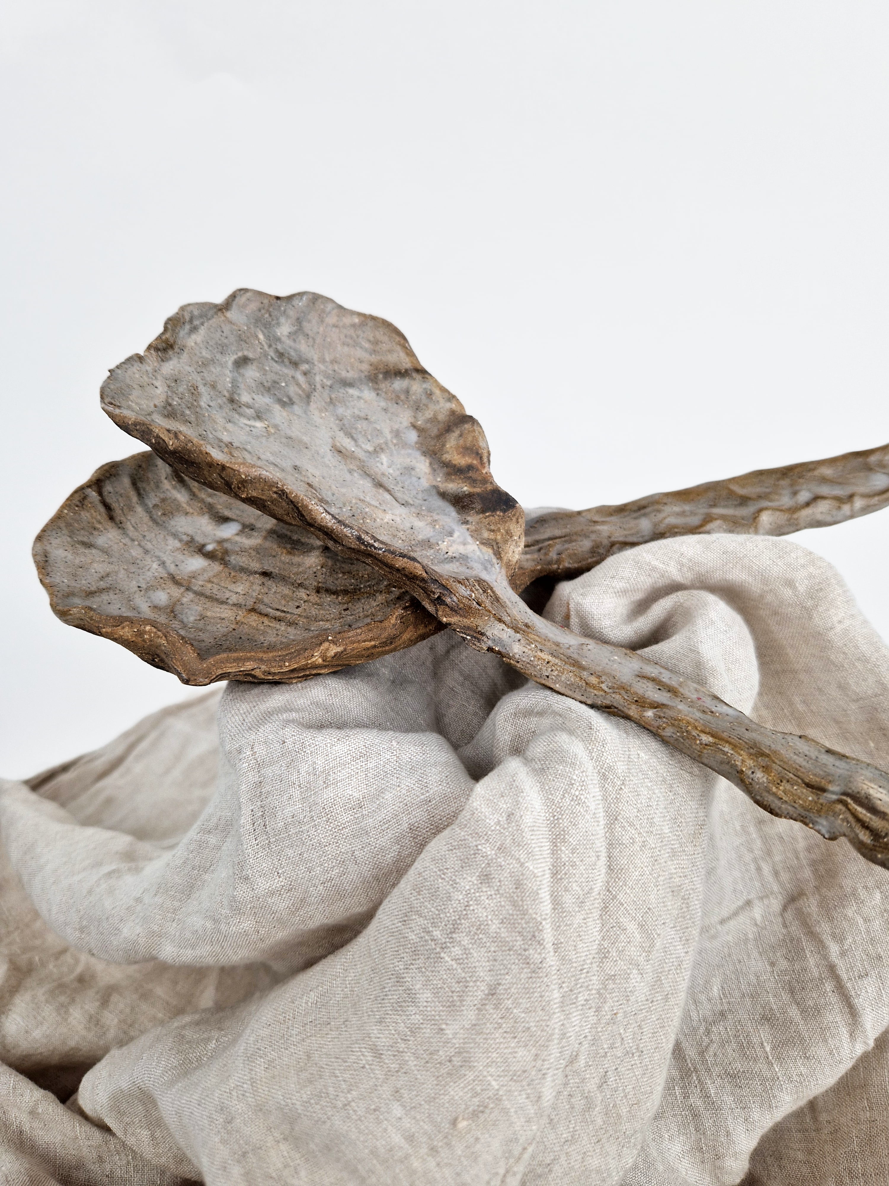 Coppia di cucchiai modellati a mano in grés porcellanato marmorizzato.